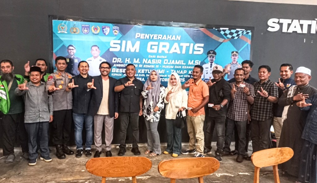 Pembina IMI Aceh yang juga Anggota Komisi III DPR RI Fraksi PKS Dr. H. M. Nasir Djamil M.Si, secara simbolis memberikan SIM gratis kepada driver Ojek Online (Ojol), Organisasi Masyarakat (Ormas) dan Sahabat Ikatan Motor Indonesia Kota Langsa di Station Cafe, sekaligus meresmikan pembentukan Sahabat IMI Kota Langsa.