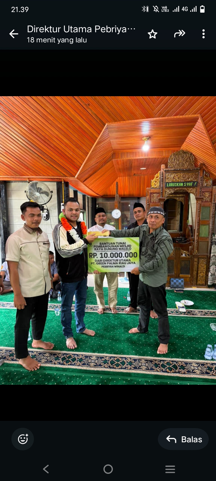 IPNews.id – KAMPAR – RIAU |Kepedulian terhadap pelestarian nilai sejarah dan keagamaan kembali ditunjukkan oleh Direktur PT Green Palma Riau Jaya, Pebriyan Winaldi, melalui penyaluran bantuan sosial untuk masjid tertua di Kabupaten Kampar yang berada di Desa Gunung Malelo, Kecamatan Koto Kampar Hulu.