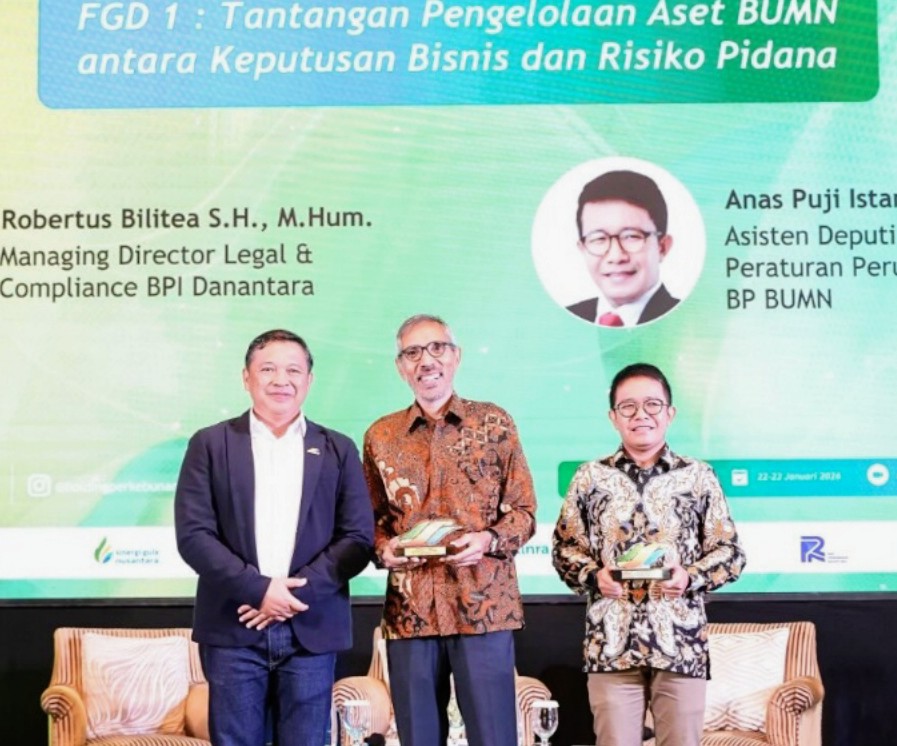Selanjutnya, kegiatan dilanjutkan dengan FGD Sesi 1 yang mengangkat topik serupa dan menghadirkan narasumber: Robertus Bilitea, Managing Director Legal & Compliance BPI Danantara, serta Anas Puji Istanto, S.H., M.H., Asisten Deputi Bidang Peraturan Perundang-Undangan BP BUMN.