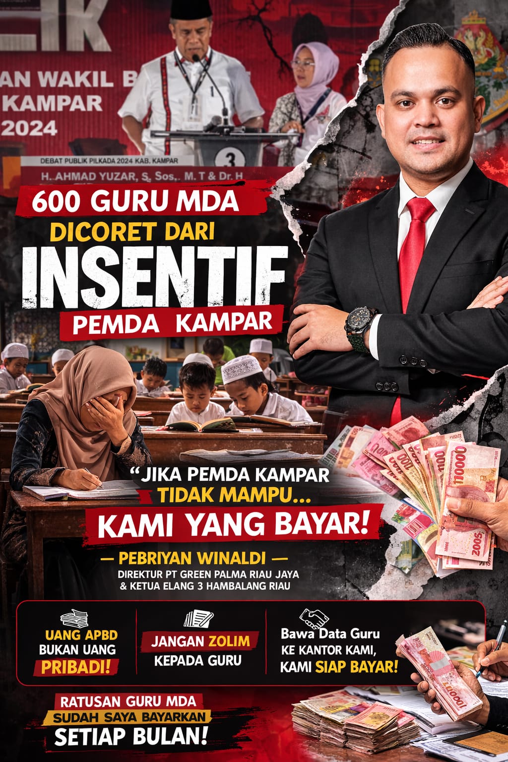 IPNews.id – RIAU |Selasa, 10 Maret 2026. Dengan beredarnya pemberitaan dari media Sapanusantara.com dengan judul “600 Guru MDA di Kampar Dicoret dari Penerima Insentif 2026, Janji Kesejahteraan Saat Pilkada Dipertanyakan”