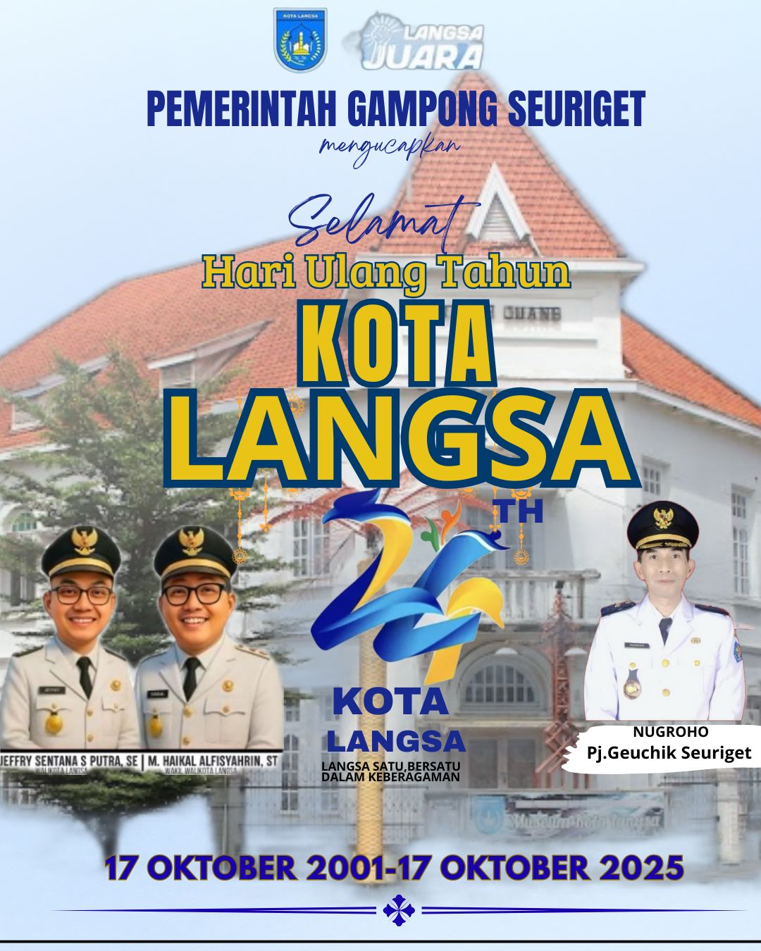 “Atas nama seluruh masyarakat Gampong Seuriget, kami mengucapkan selamat HUT Kota Langsa yang ke-24. Semoga di usia yang semakin matang ini, Kota Langsa terus berkembang pesat dan menjadi daerah yang lebih baik lagi,” ujar Nugroho.