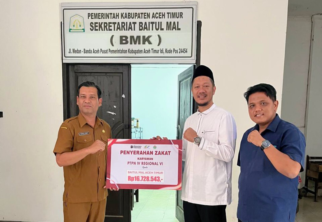 Perwakilan PTPN IV Regional VI menyerahkan zakat karyawan kepada perwakilan Baitul Mal Kabupaten Aceh Timur. Aceh Timur – Perseroan Terbatas Perkebunan Nusantara (PTPN) IV Regional VI menyerahkan zakat karyawan kepada masyarakat yang berhak menerima melalui Baitul Mal Pemerintah Daerah Kabupaten Aceh Timur.