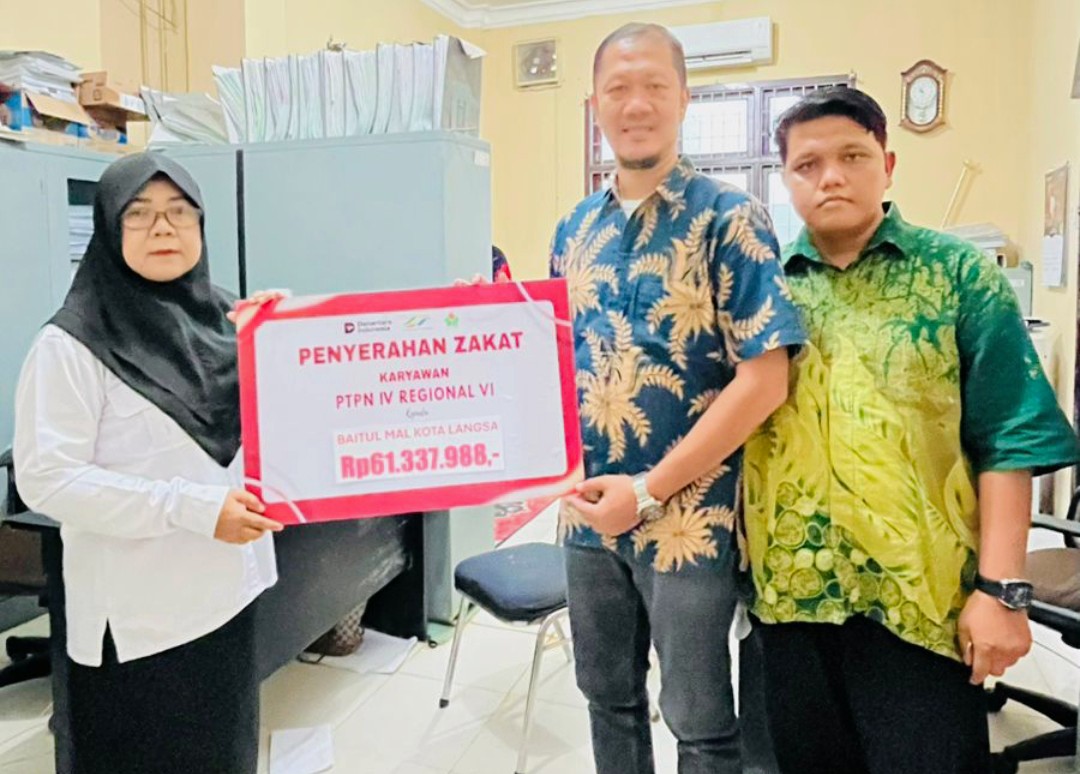 Kota Langsa – Perseroan Terbatas Perkebunan Nusantara (PTPN) IV Regional VI menyerahkan zakat karyawan kepada masyarakat yang berhak menerima melalui Baitul Mal Pemerintah Daerah Kota Langsa.