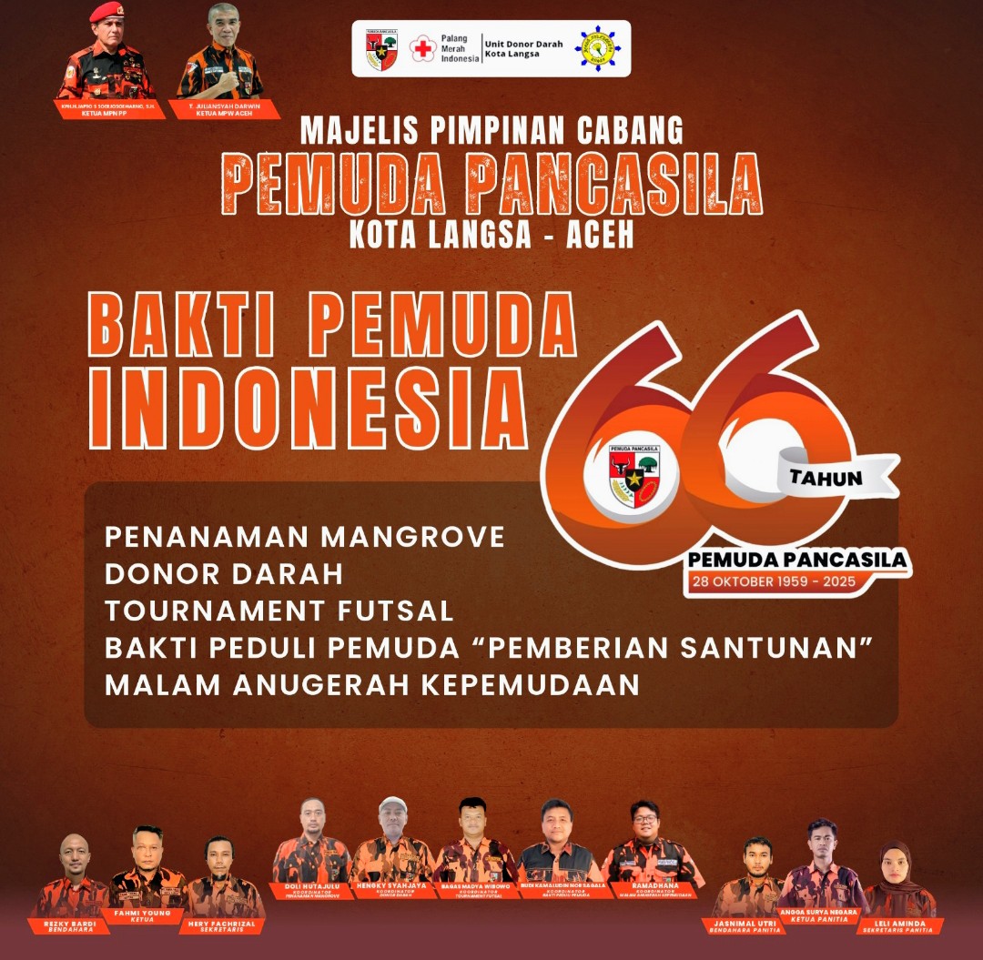 Kota Langsa – Dalam rangka memperingati Hari Ulang Tahun (HUT) Pemuda Pancasila ke-66 dan Hari Sumpah Pemuda, Majelis Pimpinan Cabang Pemuda Pancasila (MPC PP) Kota Langsa melaksanakan serangkaian kegiatan lingkungan, sosial dan olahraga.