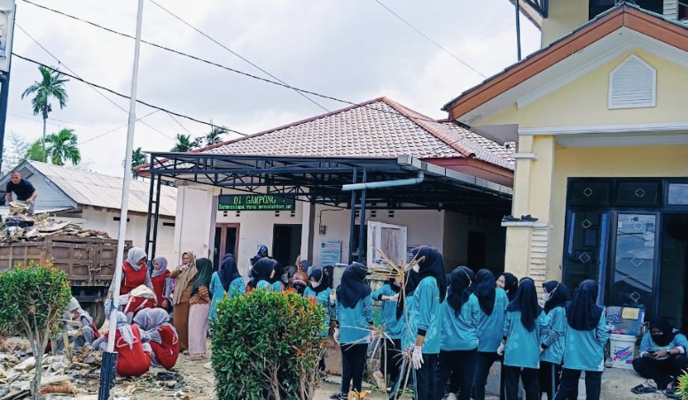 Para Mahasiswa Poltekkes Kemenkes Aceh Prodi D-III Kebidanan Langsa saat gotong royong membersihkan lingkungan dan ruangan Poskesdes serta Kantor Geuchik Gampong Karang Anyar.