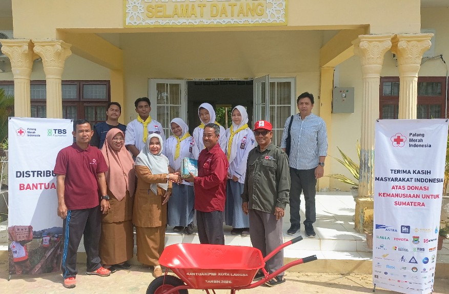 Kepala SMKN 1 Langsa Siti Sahpura menerima sejumlah bantuan alat kebersihan dari PMI Kota Langsa, Selasa (20/01/2026). Kota Langsa – Kepala Sekolah Menengah Kejujuran (SMK) Negeri 1 Langsa Siti Sahpura, S.Pd, mengucapkan terimakasih pada pihak Palang Merah Indonesia (PMI) Kota Langsa atas bantuan alat kebersihan dan Al-Qur’an yang diberikan, Selasa (20/01/2026).