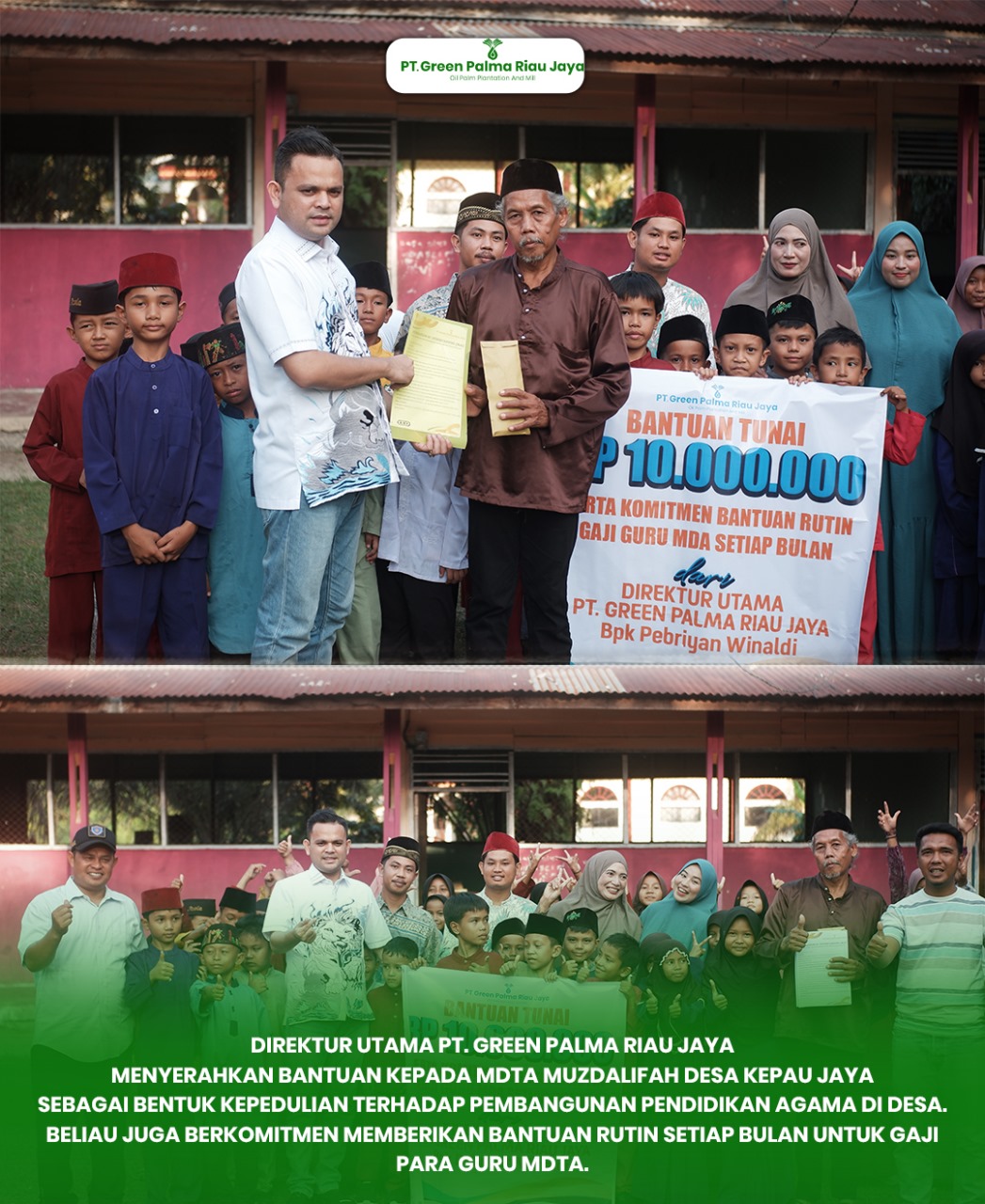 “Wujud Nyata Kepedulian Dunia Usaha terhadap Pendidikan” PT Green Palma Riau Jaya Terus Salurkan Bantuan Rp 10 Juta untuk MDTA Muzdalifah Desa Kepau Jaya